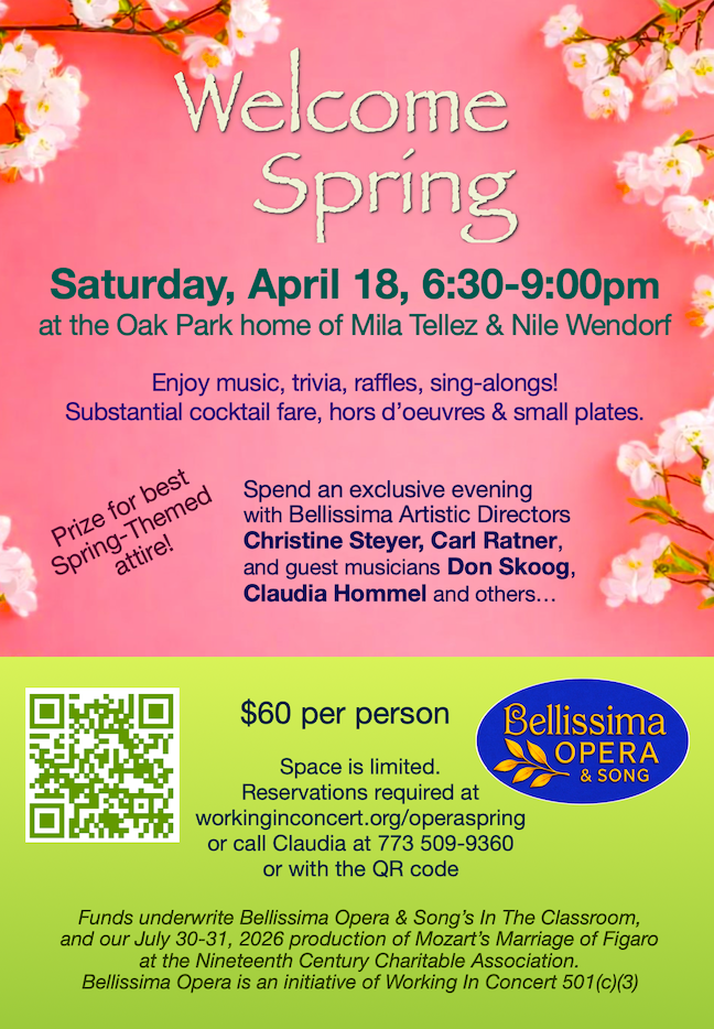 Reservations required at workinginconcert.org/operaspring or call Claudia at 773 509-9360
